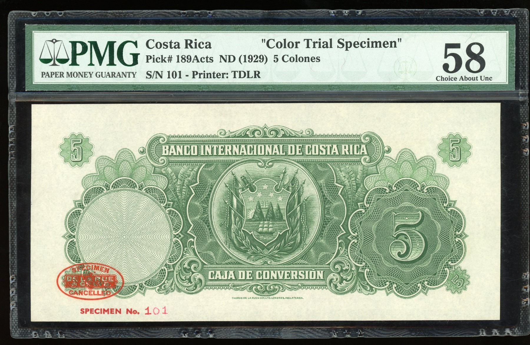 San Jose, Costa Rica, Banco Internacional, 5 colones reverse color trial specimen, (1929), PMG Choice AU 58. SCWPM-189Acts. The prior lot's concept artwork for the front design matches nicely with this color trial specimen of the back design used for the eventual Banco Internacional 5 colones of 1929. Boldy printed green ink design with strong embossing showing through, red TDLR specimen stamp and number at lower left. Very faint mounting evidence along the left margin and only minor handling for the grade. Please use this link to verify the certification number