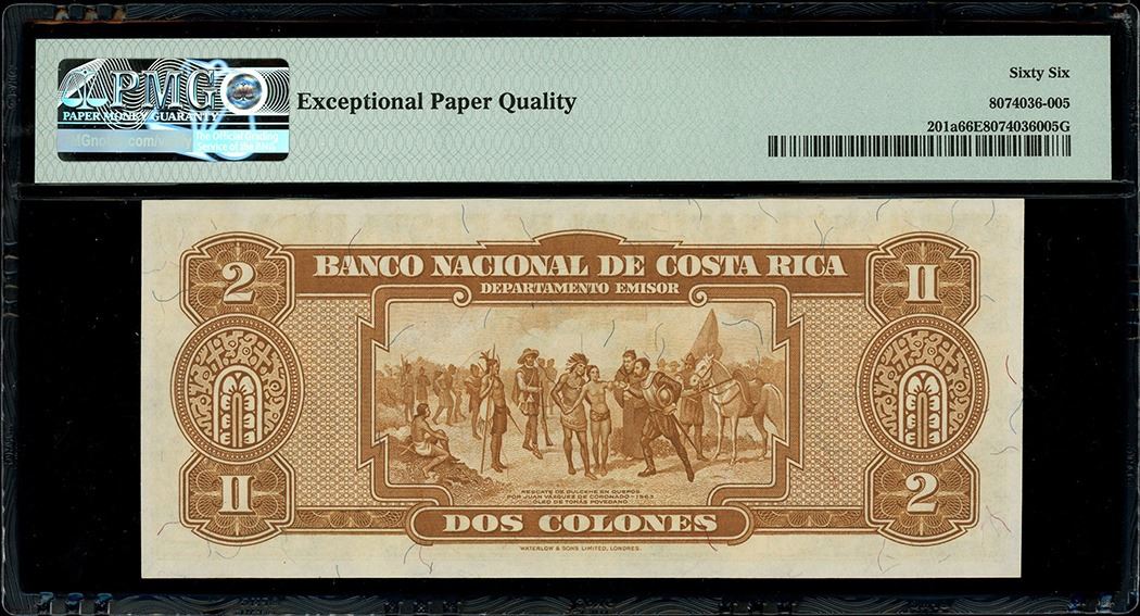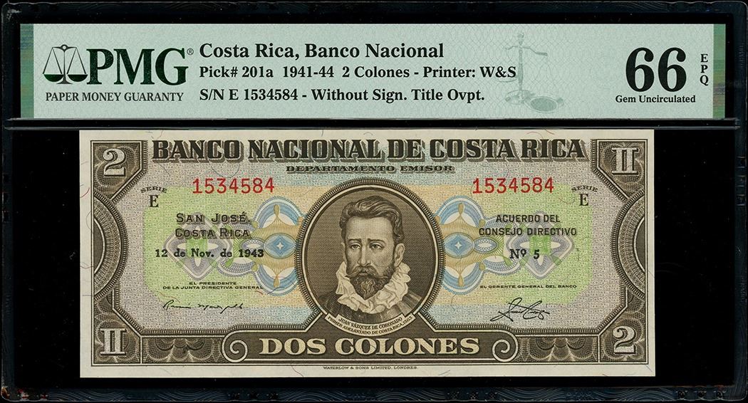 San Jose, Costa Rica, Banco Nacional, 2 colones, 12-11-1943, series E, serial 1534584, without signature title overprint, PMG Gem UNC 66 EPQ. SCWPM-201a. Very colorful and high grade example of this popular type with the portrait of Juan Vazquez de Coronado in the center. PMG #8074036-005.
