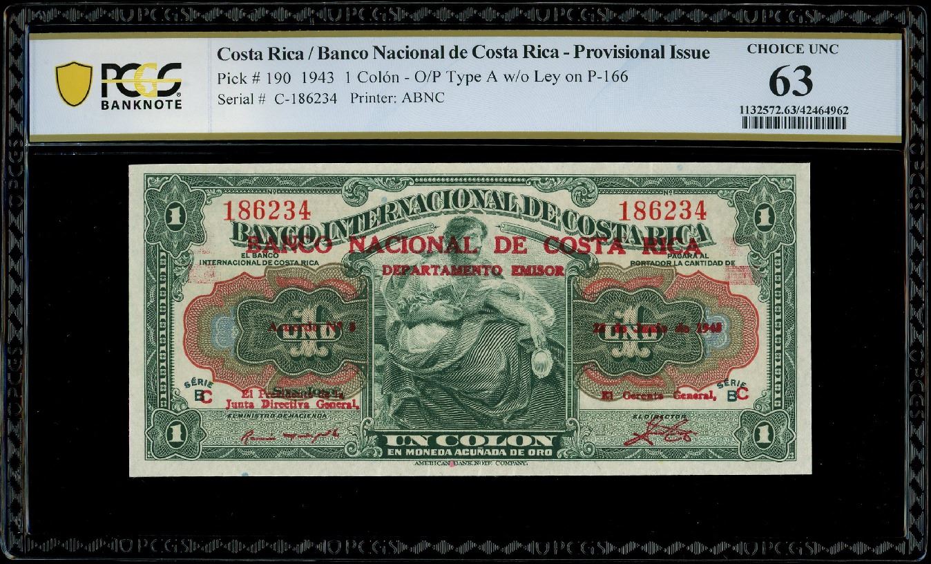 San Jose, Costa Rica, Banco Nacional de Costa Rica, 1 colon, 23-6-1943, series C, serial 186234, red overprint Type A without ley on Banco Internacional de Costa Rica 1 colon, PCGS Choice UNC 63. SCWPM-190. Bold red overprint seen on this provisional issue made during the transition from Costa Rica's Banco Internacional to the Banco Nacional. Strongly embossed and nicely centered design on bright white paper. PCGS #42464962. Pedigreed to the Tamarindo Collection.