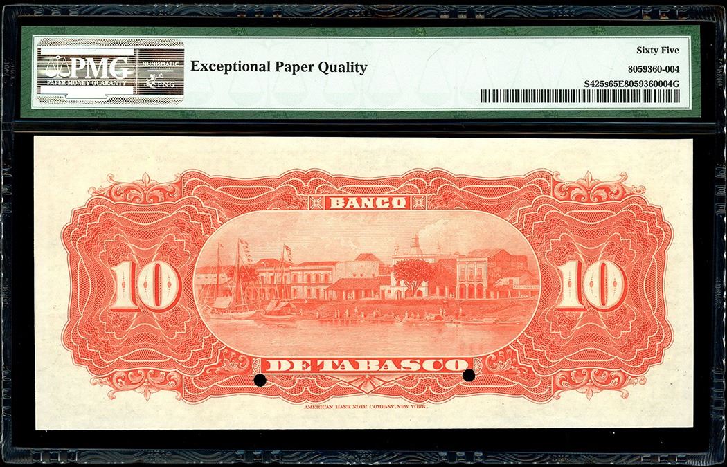 San Juan Bautista, Mexico, Banco de Tabasco, 10 pesos specimen, 1901, series A, PMG Gem UNC 65 EPQ. Frampton-M514s; SCWPM-S425s. Two POCs. Well-centered printing with great margins and colorful ink on this note from a popular Banco. PMG #8059360-004.