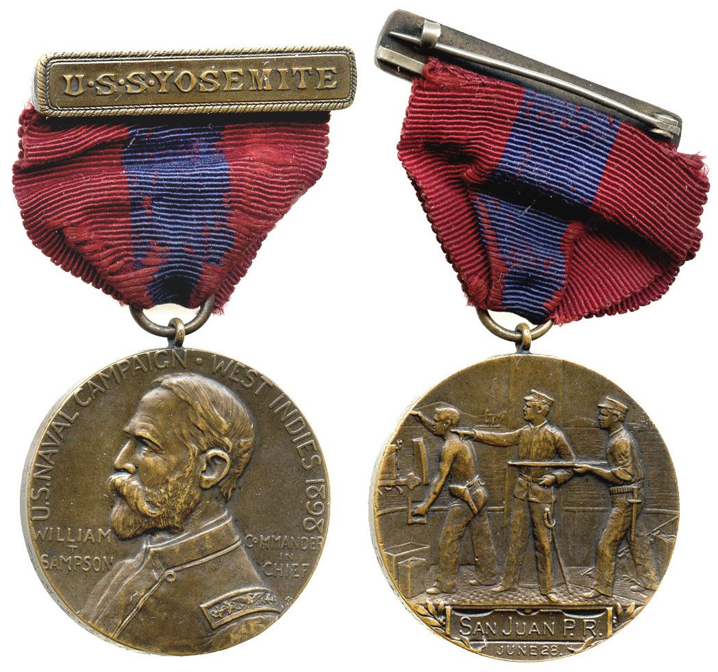 San Juan, Puerto Rico, bronze medal with red-and-blue ribbon, 1898, U.S. Naval Campaign West Indies (Spanish American War), Commander in Chief Sampson, with U.S.S. YOSEMITE on bronze bar above the ribbon. 39mm; 35.9 grams total. Bust of William E. Sampson on obverse, naval soldiers on reverse, SAN JUAN, P.R. / JUNE 28 in exergue, edge engraved (straight up and down) with WM. B. STRATTON Q.M 3C (Quarter Master Petty Officer 3rd Class), the seaman to whom this medal was originally presented. Dark XF. On June 16-17, 1898, the USS Yosemite was assigned to intercept the Spanish vessel Purissima Concepcion but failed amid controversy. Rare