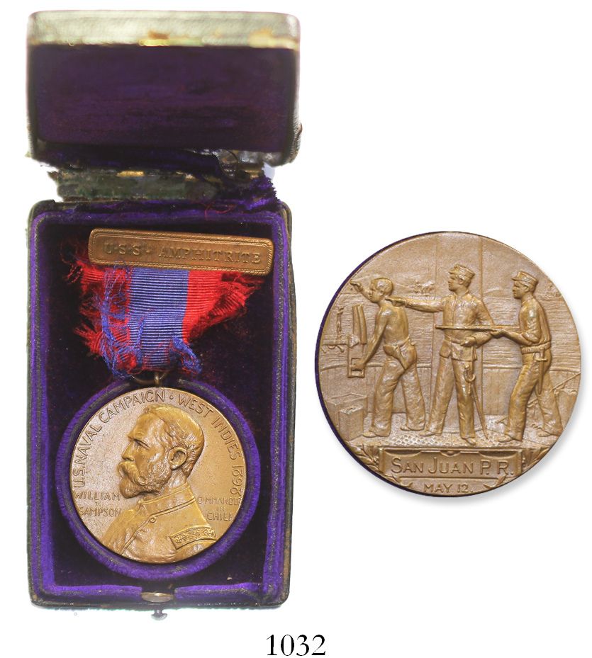 San Juan, Puerto Rico, bronze medal with red-and-blue ribbon, 1898, U.S. Naval Campaign in the West Indies (Spanish American War), Commander in Chief Sampson, with U.S.S. AMPHITRITE on bronze bar above the ribbon, in original presentation box, rare. 39mm, 33.38 grams. Phase II Sampson medal (bust of Rear Admiral William E. Sampson on obverse, naval soldiers on reverse, SAN JUAN, P.R. / MAY 12 in exergue), the edge engraved with JAMES LOGAN, F.1C (the seaman to whom this medal was originally presented), bold AU with original color, the ribbon in tatters and the box well worn, but all intact. The U.S.S. Amphitrite was among several ships that bombarded San Juan three times on May 12, 1898. Rare Spanish American War medals like this one are highly regarded; see our Auction #12 for a similar one sold for $1,534. Accompanied by research papers on the ship and its crew.