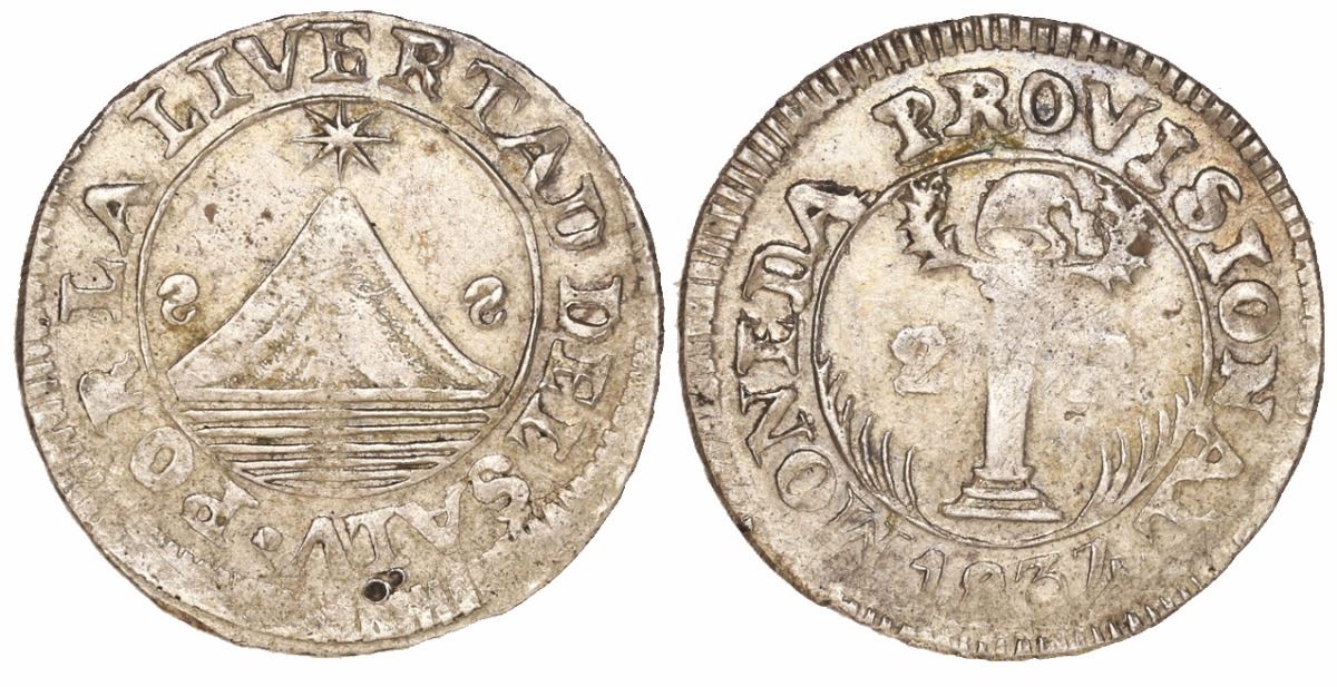 San Salvador, El Salvador, 2 reales, 1832, no assayer, retrograde S's for mintmark, error "LIVERTAD" in legend, very rare. 5.03 grams. XF with weak centers (most of the legends bold), off-center volcano side, unlisted variety with obverse legend POR LA LIVERTAD DEL SALV, and a choice specimen of this crude but popular provisional issue under the Central American Republic