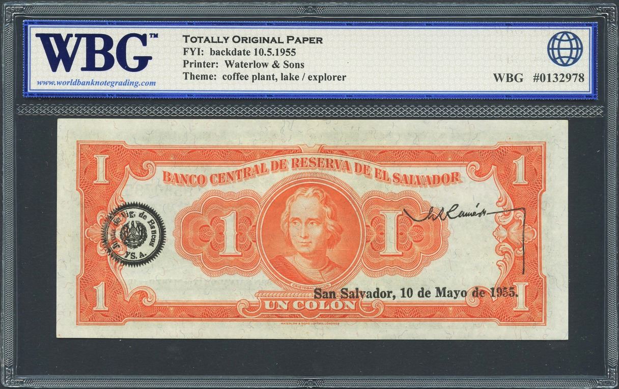 San Salvador, El Salvador, Banco Central de Reserva, 1 colon, 17-3-1954, series QA, certified WBG UNC Choice 64 TOP. SCWPM-87. Serial 8550785, with validation stamp dated 1-5-1955. High grade with great margins and color. WBG #0132978. Acquired from Kay Phillipsen (San Salvador) ca. 1977.