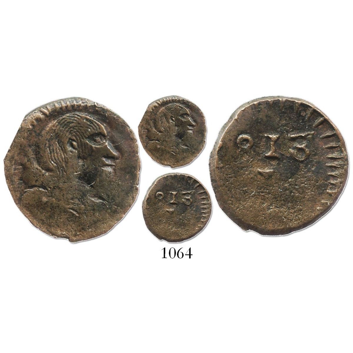 Santa Marta (Royalist), Colombia, copper 1/2 real, Ferdinand VII, 1813, very rare. R-109.1; KM-C3. 1.2 grams. This small, crude coin with portrait on obverse and bold date on reverse is very important as the only issue of Colombia or Venezuela (possibly struck in Caracas) with the bust of Ferdinand VII (albeit an imaginary one). This specimen, VF+ and almost perfectly round, is exceptional compared to the others known. Note KM does not give values beyond VG grade, which it values at $2,500.