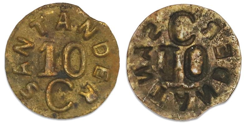 Santander (Bucaramanga), brass uniface 10 centavos (necessity coinage), (1902).