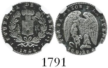 Santiago, Chile, 1/2 real, 1844IJ, encapsulated NGC MS-62.