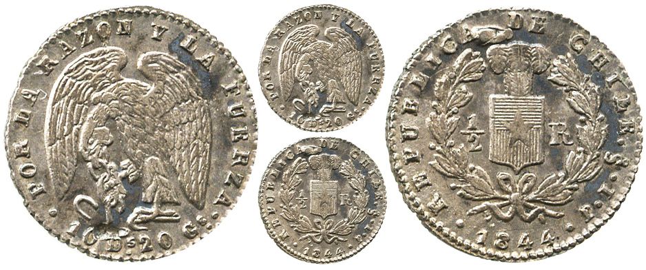 Santiago, Chile, 1/2 real, 1844IJ. KM-98.2. 1.6 grams. Lightly toned and lustrous UNC with and old gouge from the minting process below the condor (protruding on the other side), also a curious error (normal for this year) with the word "Y" ("and") rendered as a "V".