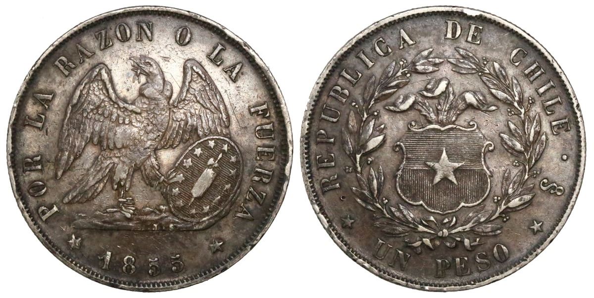 Santiago, Chile, 1 peso, 1855. Covarrubias-45 (for type); KM-129. 25.08 grams. Designed by American engraver John Sheriff. Toned AU- with minor rim dings, glossy fields.