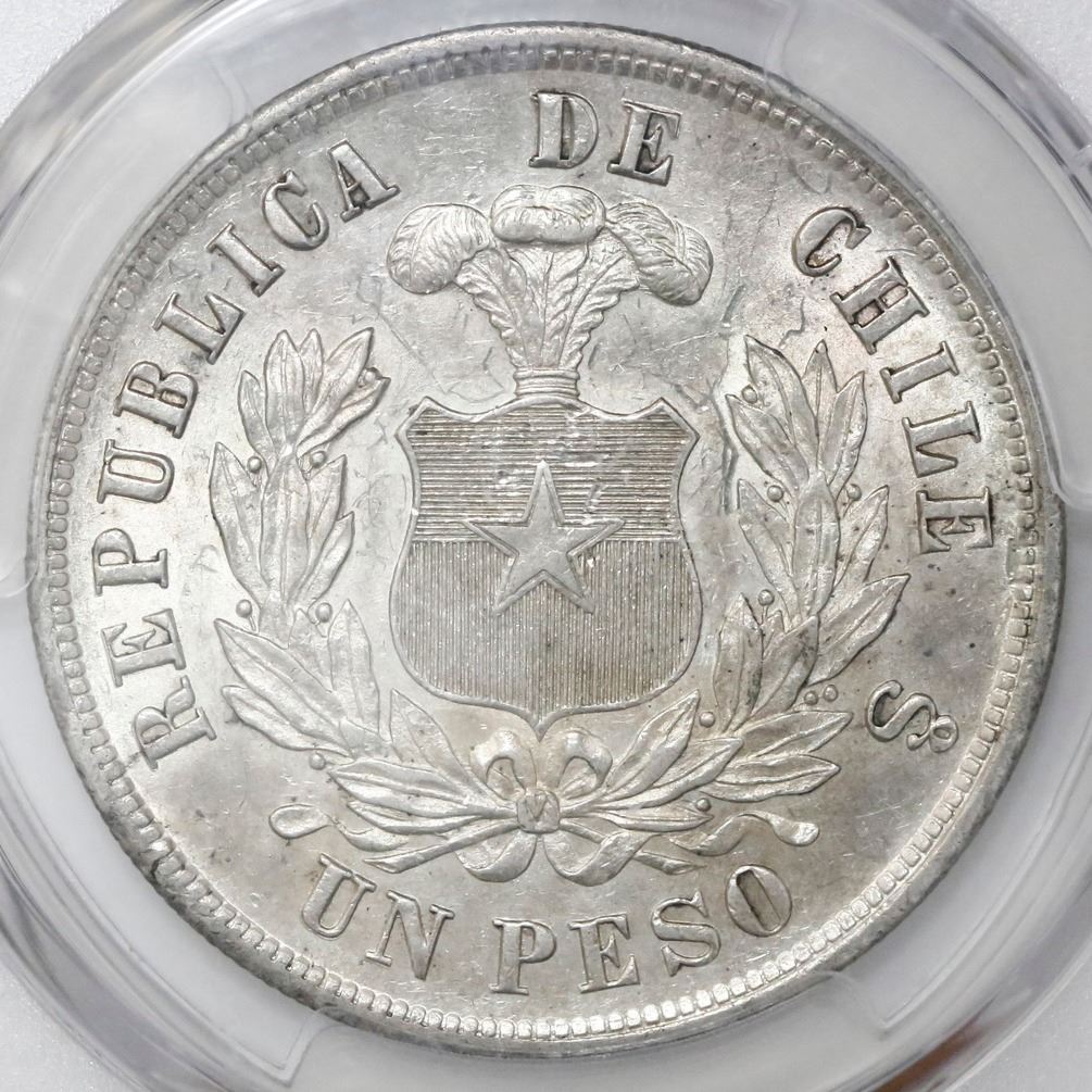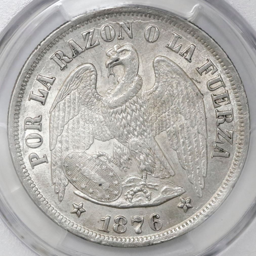 Santiago, Chile, 1 peso, 1876, PCGS AU detail / scratch. KM-142.1. Lustrous and wear-free, the stated scratches in fields on arms side rather light and possibly just bagmarks. PCGS #36271751.