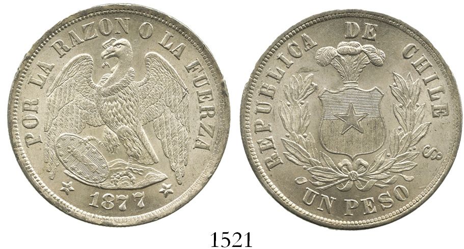 Santiago, Chile, 1 peso, 1877. KM-142.1. 24.8 grams. Mint State with muted luster, no problems.