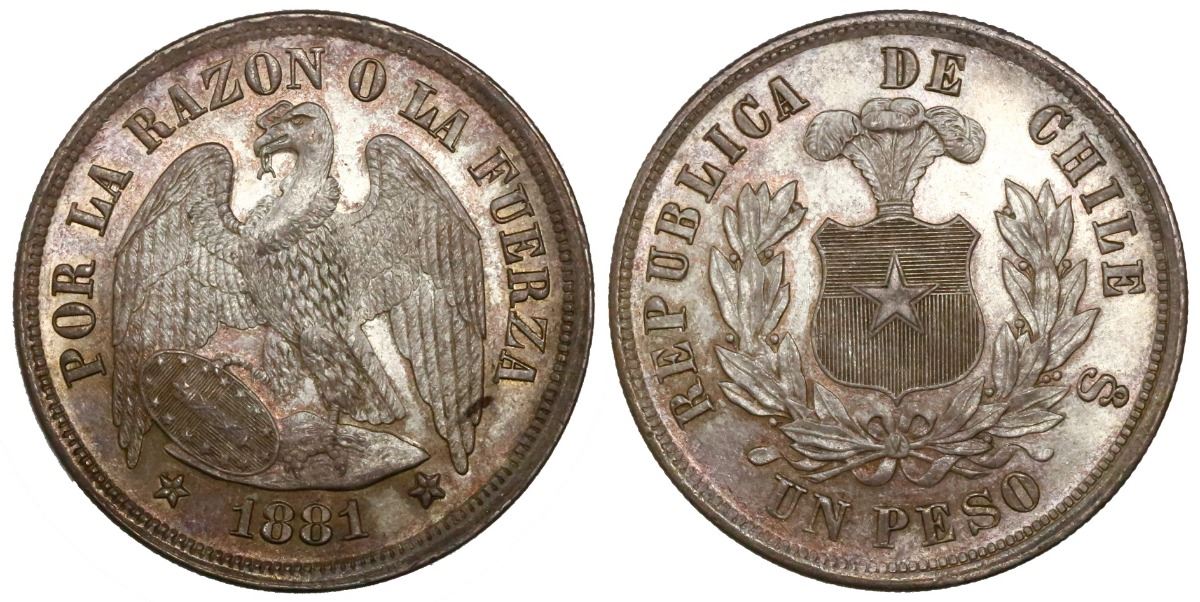 Santiago, Chile, 1 peso, 1881. KM-142.1. 24.85 grams. Lustrous Mint State with light rainbow toning.