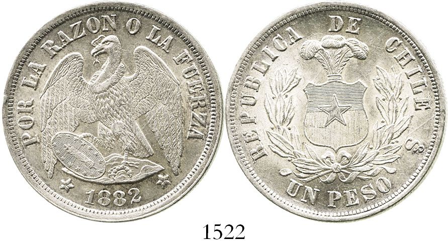 Santiago, Chile, 1 peso, 1882. KM-142.1. 25.4 grams. Mint State with flashy luster, no problems.