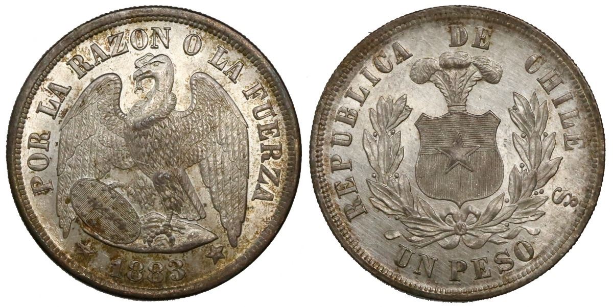 Santiago, Chile, 1 peso, 1883. KM-142.1. 24.97 grams. Lustrous Mint State with faint spots of toning.