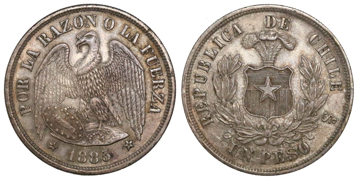 Santiago, Chile, 1 peso, 1885/3. KM-142.1. 24.98 grams An uncommon overdate. AU with lovely rainbow toning.