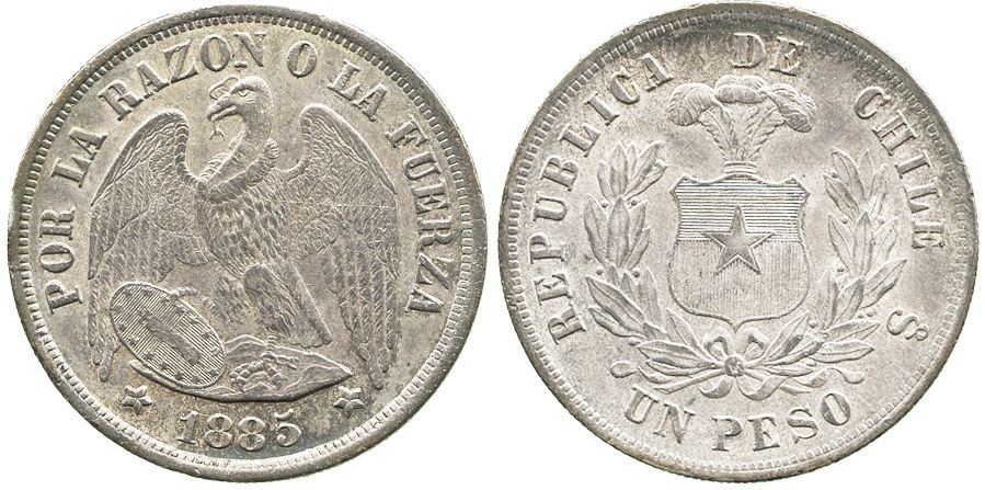 Santiago, Chile, 1 peso, 1885. KM-142.1. 24.9 grams. Choice AU+ with beautiful rainbow-toning all over, better date.