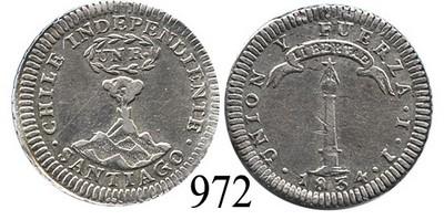 Santiago, Chile, 1 real, 1834IJ. KM-91. 3.3 grams. Slightly lustrous XF, no toning, full rims, one-year type.