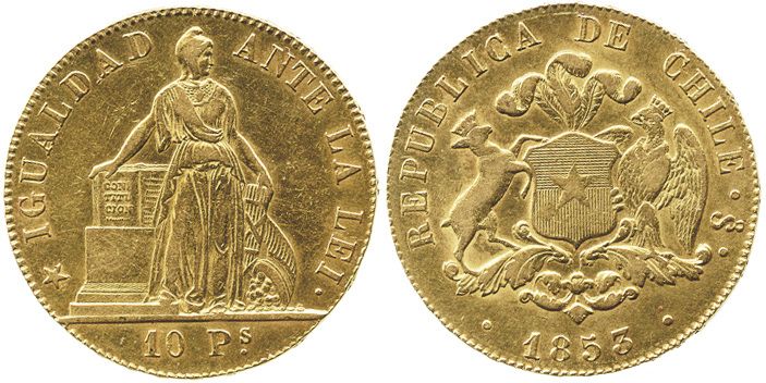 Santiago, Chile, 10 pesos, 1853. KM-123. 15.2 grams. Problem-free AXF with hint of luster.