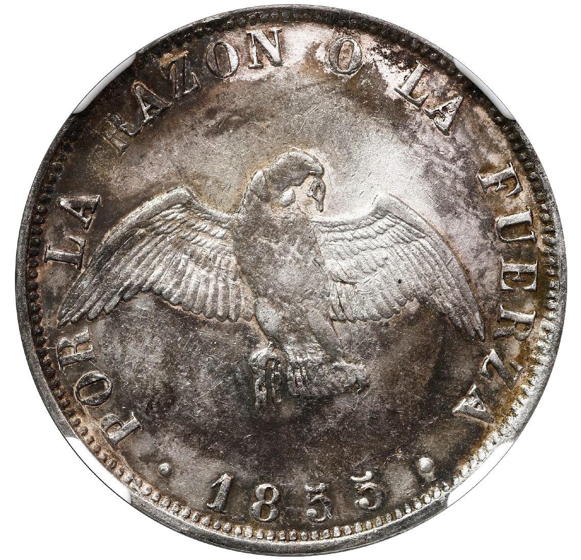 Santiago, Chile, 50 centavos, 1855, NGC SS Central America / Shipwreck Effect / Pascual Esquerra Hoard. KM-128. A nicer example than usually encountered with sharp Mint State details and much luster in spite of the minor surface encrustation. Recovered from: S.S. Central America, sunk in 1857 in deep water off North Carolina