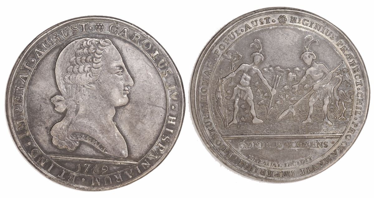 Santiago, Chile, 8R-sized silver proclamation medal, Charles IV, 1789. 26.51 grams. 43mm. Obverse with bust of king inside legend CAROLUS IV. HISPANIARUM. ET. IND. IMPERAT. AUGUST, with NAZAUAL F. in truncation of bust and date 1789 in exergue; reverse with natives in field inside legend HIGINIUS PREAFECT. CHIL. PROCLAMIVIT IMPERIUM. ET OBTULIT HOMAG. POPUL. AUST., with OMNIBUS CLEMENS / NAZAUAL INCIDIT in exergue. Attractively toned VF+.