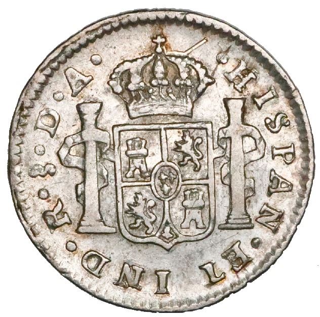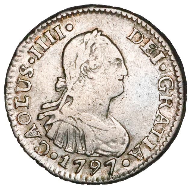 Santiago, Chile, bust 1/2 real, Charles IV, 1797DA, "CAOLUS" error, rare, NGC VF details / rev scratched. KM-57; Cal-344. 1.62 grams. No toning but hints of luster, two light marks to right of crown on reverse, scarce and interesting error lacking the R in the king's name. NGC #5933767-001.