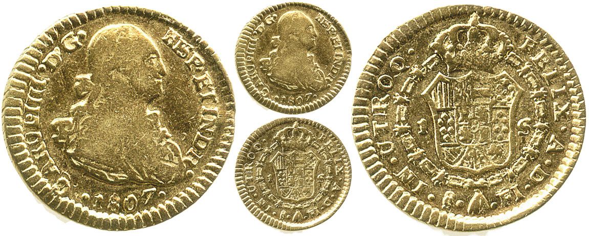 Santiago, Chile, bust 1 escudo, Charles IV, 1807FJ, rare. KM-61; CT-605. 3.4 grams. Low mintage of just 544 coins, somewhat crude all over (as made), including repunched lettering and weak bust, but lustrous and high grade (AU).