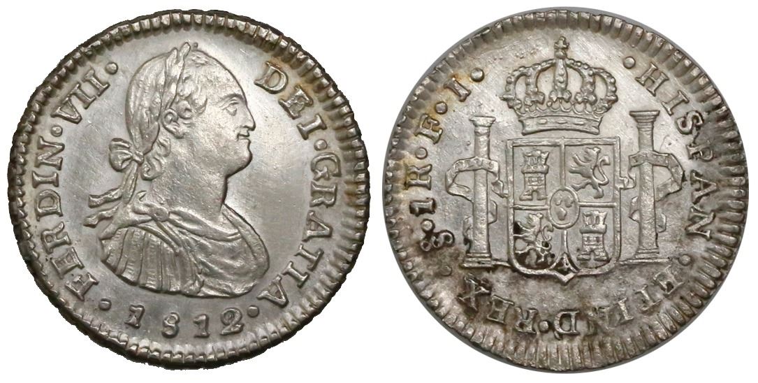 Santiago, Chile, bust 1 real, Ferdinand VII (bust of Charles IV), 1812FJ.
