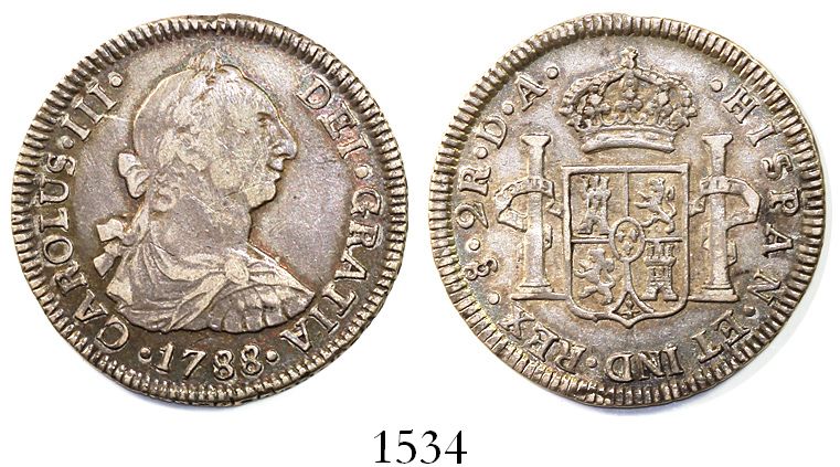 Santiago, Chile, bust 2 reales, Charles III, 1788DA. KM-30; CT-1431. 6.70 grams. Broad-flan VF with rich rainbow toning around details, hint of luster.