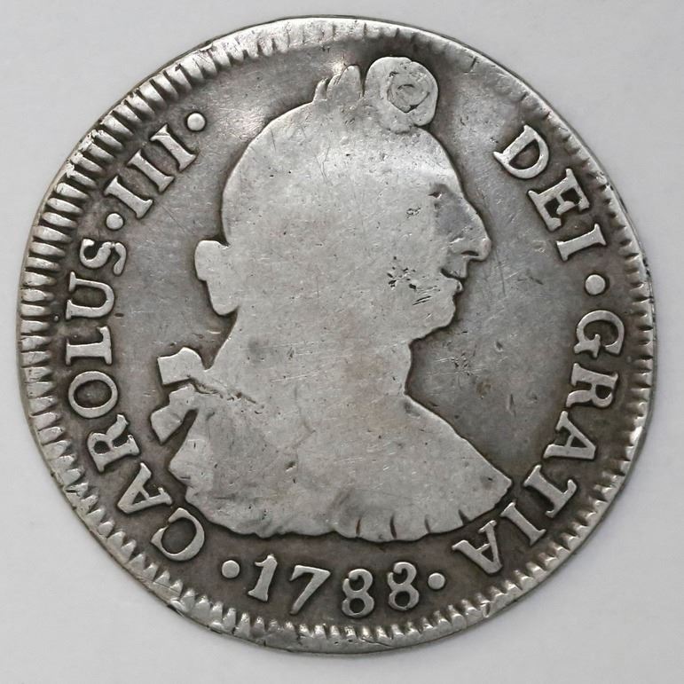Santiago, Chile, bust 2 reales, Charles III, 1788DA. KM-30; CT-1431. 6.48 grams. Cleaned Fine, plugged hole at top, previously gilt.