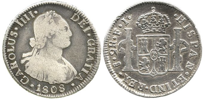 Santiago, Chile, bust 2 reales, Charles IV, 1808FJ. KM-59; CT-1055. 6.3 grams. Deeply toned Fine (good contrast) with minor flan-flaws.