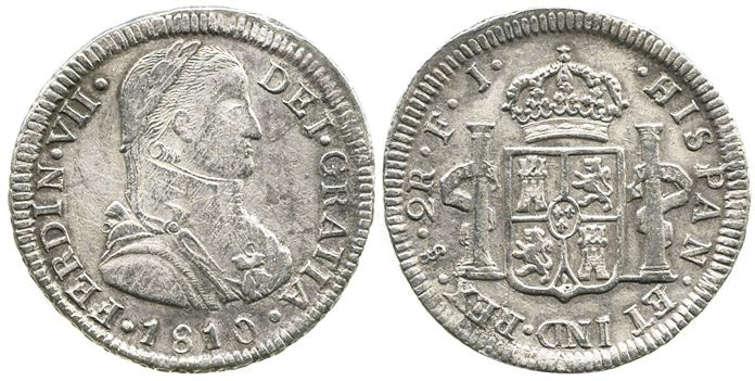 Santiago, Chile, bust 2 reales, Ferdinand VII transitional ("admiral's bust"), 1810FJ. KM-74; CT-1016. 6.6 grams. Bold VF+ with slightly grainy surfaces, broad flan (extending beyond rims), good toning, scarce 3-year type.