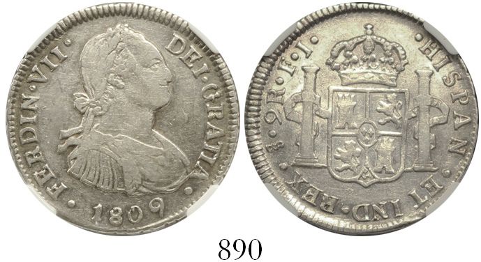 Santiago, Chile, bust 2 reales, Ferdinand VII transitional (bust of Charles IV), 1809FJ, encapsulated NGC XF 45. KM-66; CT-1015. Lustrous and high grade but with very light surface hairlines (probably net-graded), starting to tone.