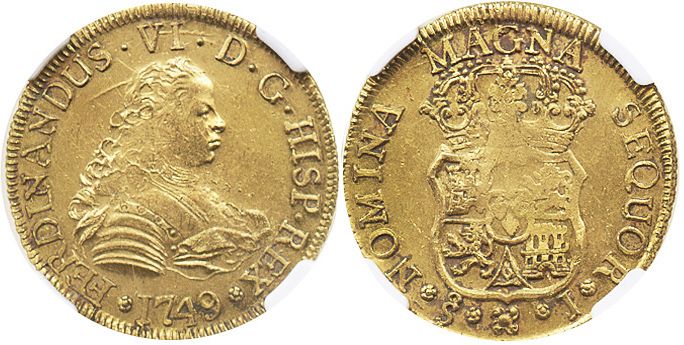 Santiago, Chile, bust 4 escudos, Ferdinand VI, 1749J, from the Luz (1752), encapsulated NGC AU 58.