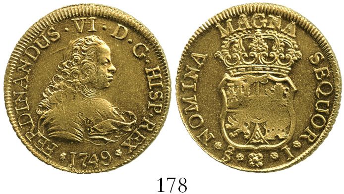 Santiago, Chile, bust 4 escudos, Ferdinand VI, 1749J, from the Luz (1752). KM-2; CT-133. 13.5 grams. Mint State with typically weak centers, nice luster but slightly muted by graininess in fields, off-center strike. From the Luz (1752).
