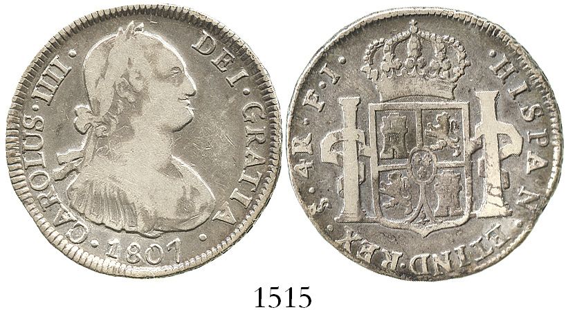 Santiago, Chile, bust 4 reales, Charles IV, 1807FJ. KM-60. 13.1 grams. Fine with rainbow-toned fields, reverse rim crude (as made).