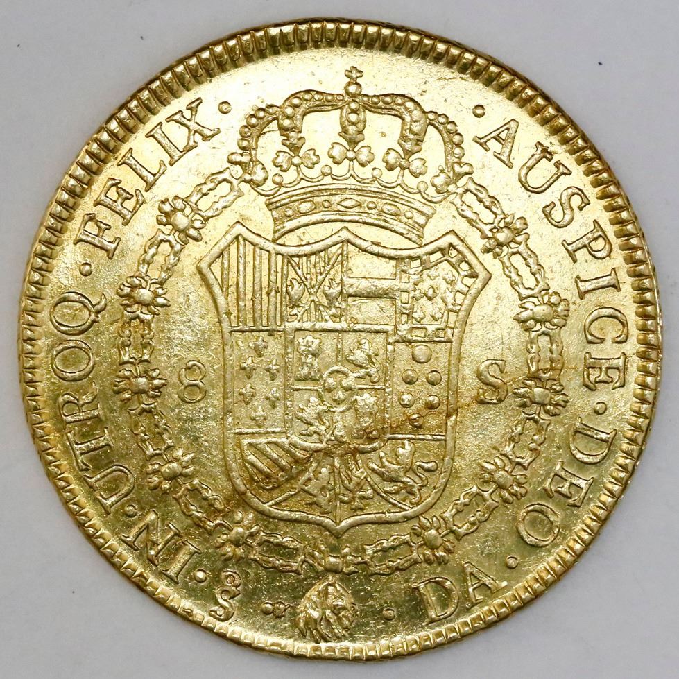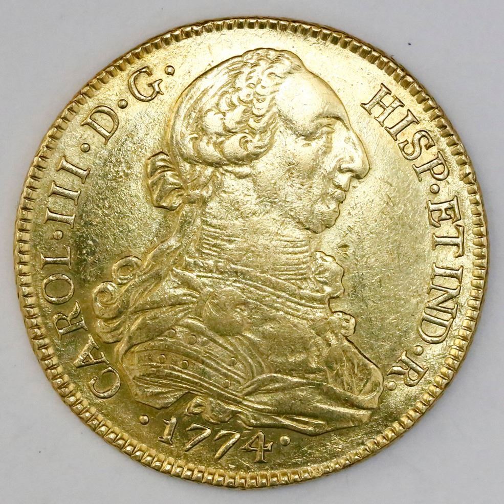 Santiago, Chile, bust 8 escudos, Charles III, 1774DA. CT-222; KM-27. 26.88 grams. XF, very lightly cleaned, for whatever reason a date we have not previously offered. Pedigreed to the Coin Galleries (Stack's) auction of April 2010, with original lot-tag (trimmed) #1754.