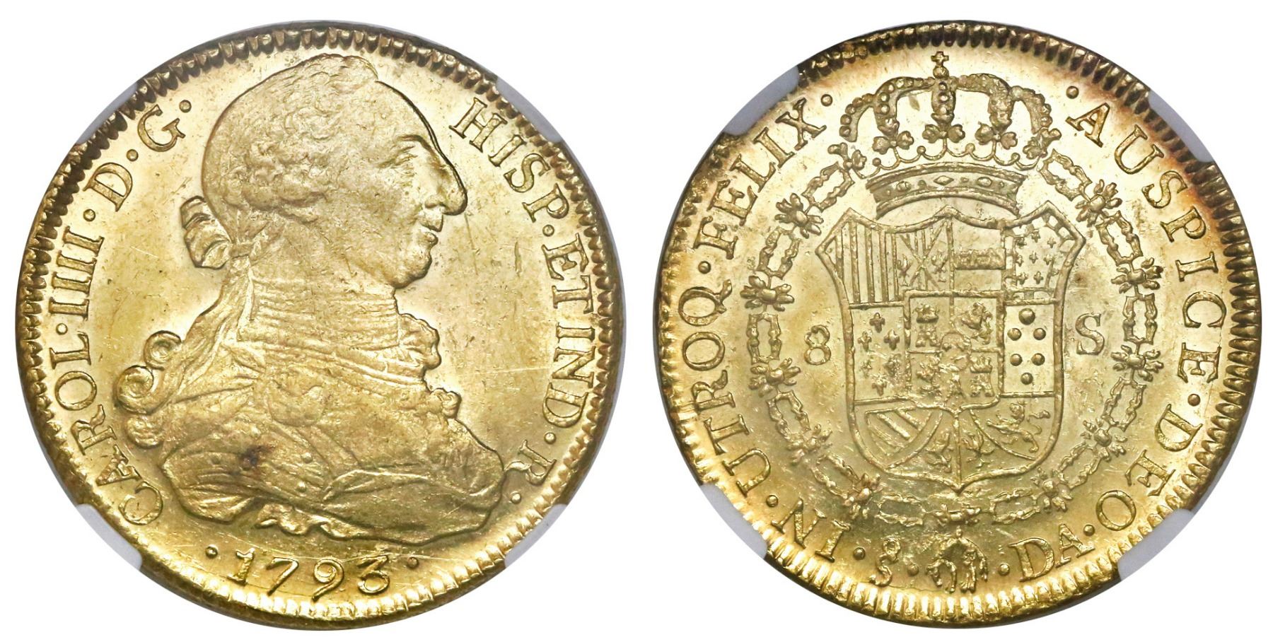 Santiago, Chile, bust 8 escudos, Charles IV (bust of Charles III), 1793DA, NGC MS 62, finest known i