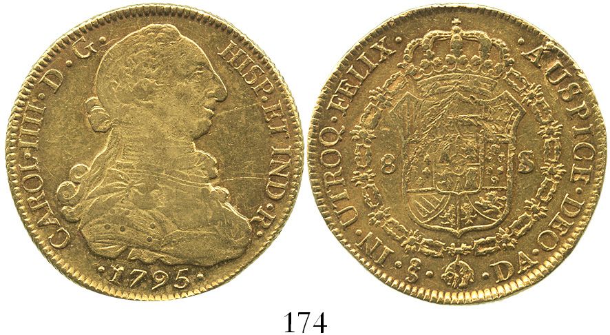 Santiago, Chile, bust 8 escudos, Charles IV (bust of Charles III), 1795DA. KM-54; CT-154. 27.0 grams. Nicely toned XF with underlying luster, old (minor) damage on upper part of shield, part of reverse edge crude.