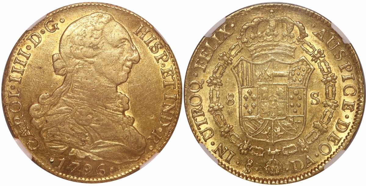 Santiago, Chile, bust 8 escudos, Charles IV (bust of Charles III), 1796DA, encapsulated NGC AU 58. CT-155; KM-54. Choice luster and ample toning, very attractive.