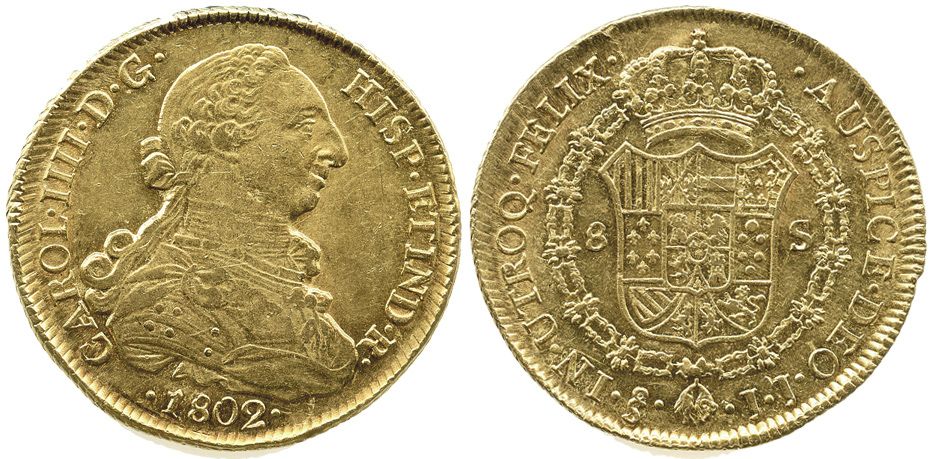 Santiago, Chile, bust 8 escudos, Charles IV (bust of Charles III), 1802JJ.