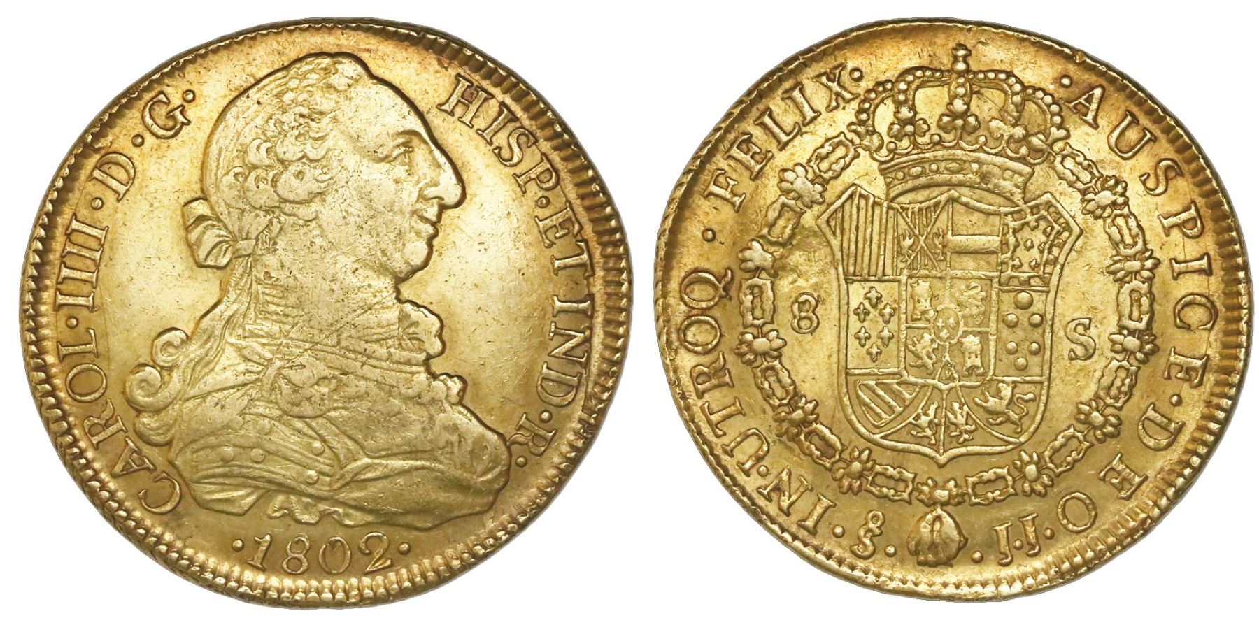 Santiago, Chile, bust 8 escudos, Charles IV (bust of Charles III), 1802JJ.