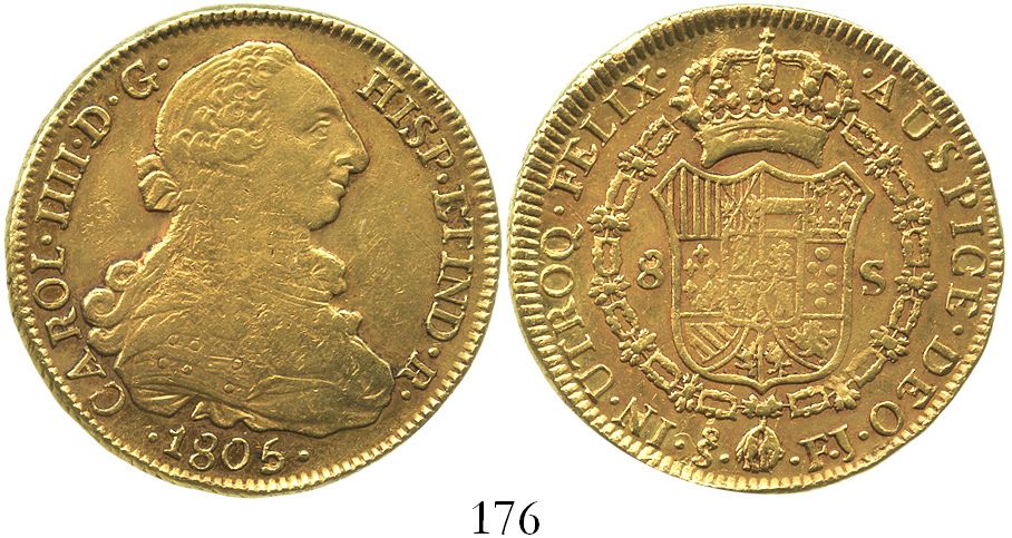 Santiago, Chile, bust 8 escudos, Charles IV (bust of Charles III), 1805FJ.
