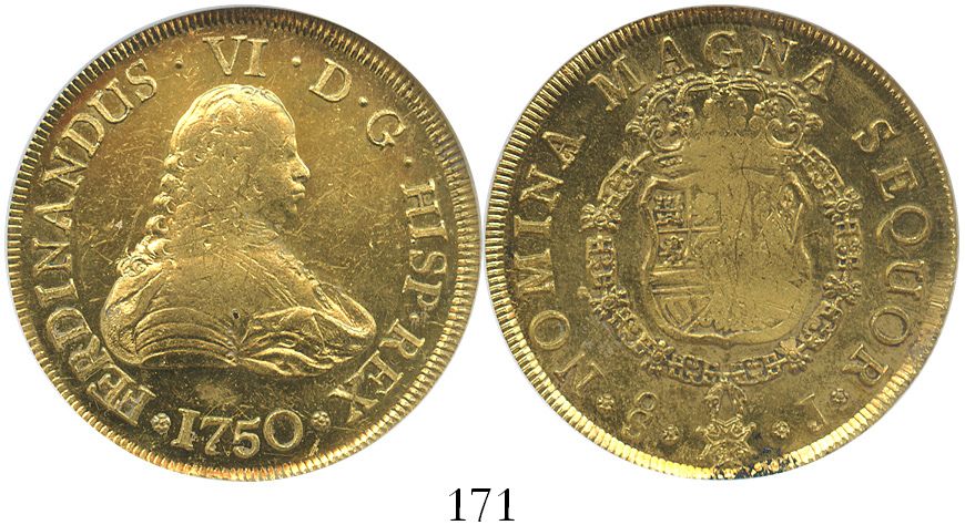 Santiago, Chile, bust 8 escudos, Ferdinand VI, 1750J, encapsulated NGC MS 62, from the Luz (1752), i