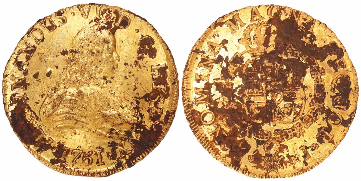 Santiago, Chile, bust 8 escudos, Ferdinand VI, 1751J, encrusted as from the Luz (1752). CT-72; KM-3. 27.18 grams. Lustrous Mint State details, better struck than most but with patches of dark encrustation all over and with two small pecks in field behind the neck (filled with debris), intriguing as a rare example of encrusted shipwreck gold. From the Luz (1752), and pedigreed to the Thomas Gray collection and formerly displayed at the ANA Money Museum's "Treasures of the Deep" exhibit (2014-15), also pedigreed to our Auction #11, with original lot-tag #103.
