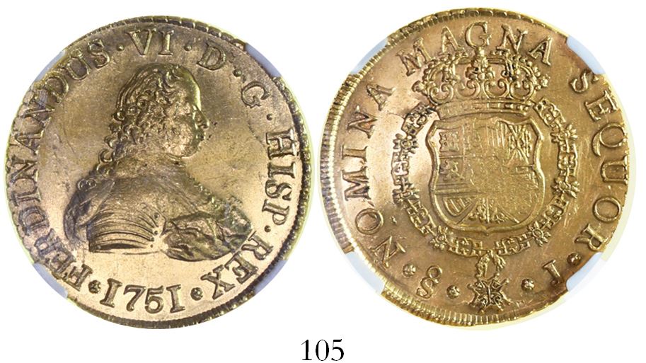 Santiago, Chile, bust 8 escudos, Ferdinand VI, 1751J, from the Luz (1752), encapsulated NGC MS 61. CT-72; KM-3. Highly lustrous but with usual central weakness (net grade, in our opinion), slightly off-center reverse. From the Luz (1752).