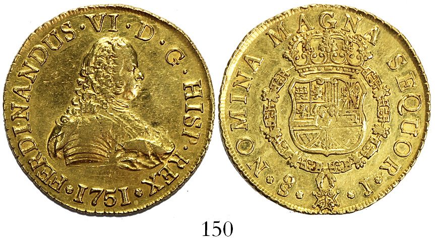 Santiago, Chile, bust 8 escudos, Ferdinand VI, 1751J, from the Luz (1752). KM-3; CT-72. 26.95 grams. AU with muted luster, hint of polishing, nicer than average strike with weakness only on top of shoulder and corresponding spot in the shield on reverse. From the Luz (1752).