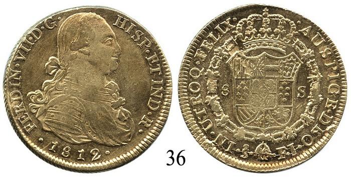 Santiago, Chile, bust 8 escudos, Ferdinand VII (bust of Charles IV), 1812FJ, lustrous XF with scratches. KM-78. 26.7 grams. Highly lustrous AU+ with hairline scratches, off-center strike.