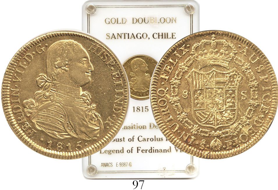 Santiago, Chile, bust 8 escudos, Ferdinand VII (bust of Charles IV), 1815FJ, in custom plastic holder with captions and reference to accompanying ANACS photo-certificate. CT-123; KM-78. About 6" x 4". AU-UNC with light surface hairlines on obverse, minor planchet laminations near center of reverse, light red toning all over. With 1981 ANACS photo-certificate #E-9387-G.