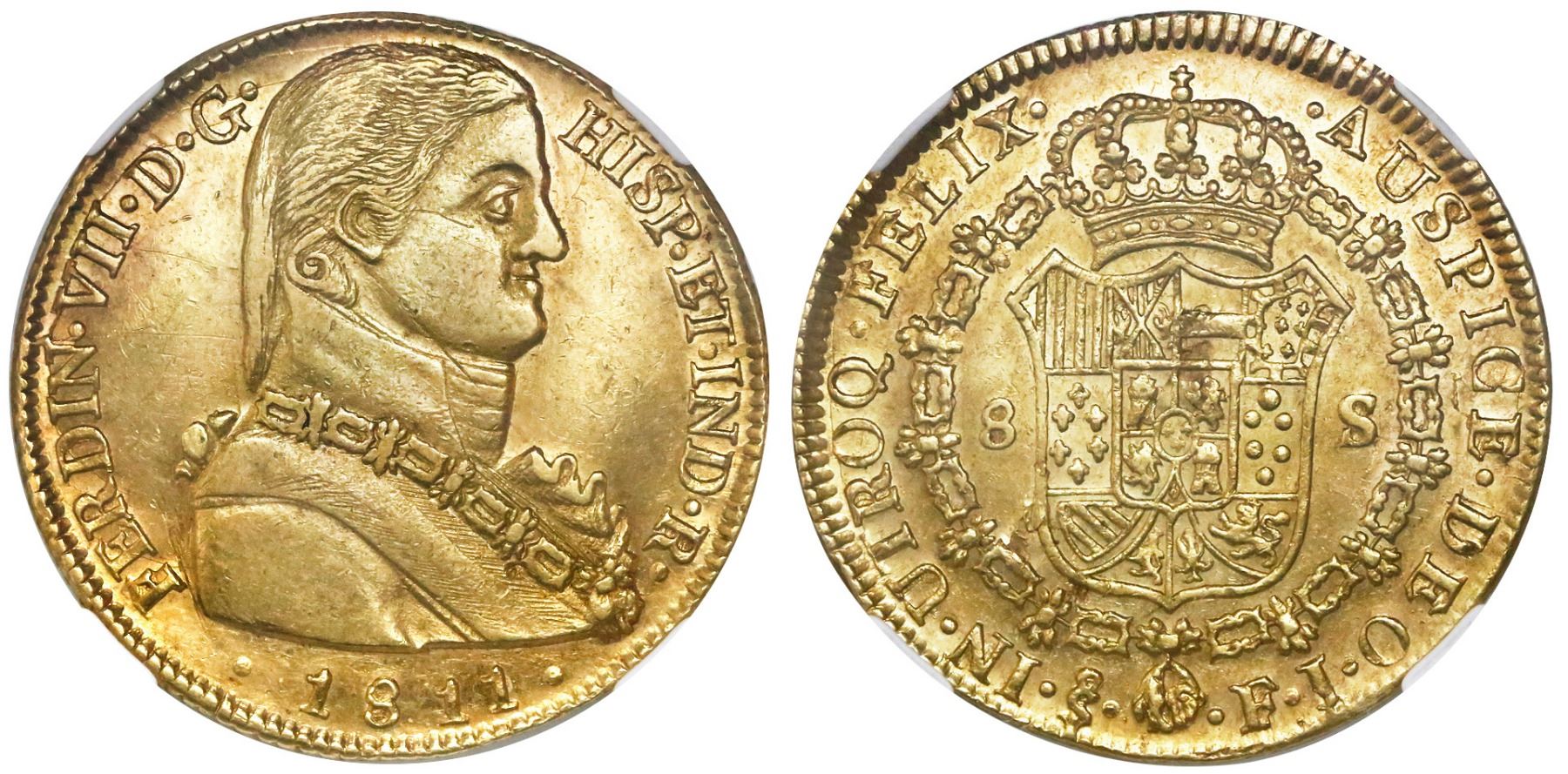Santiago, Chile, bust 8 escudos, Ferdinand VII transitional ("admiral" bust), 1811FJ, NGC AU 58. CT-116; KM-72. Muted luster and faint toning, slight central bulge, the NGC slab chipped on bottom edge. NGC #2821546-007.
