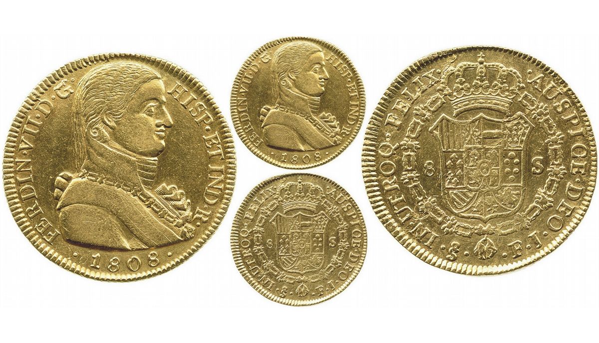 Santiago, Chile, bust 8 escudos Ferdinand VII transitional ("admiral's bust"), 1808FJ, rare. KM-72; CT-112. 27.0 grams. Bold AU details but lightly polished surfaces, first year of type.